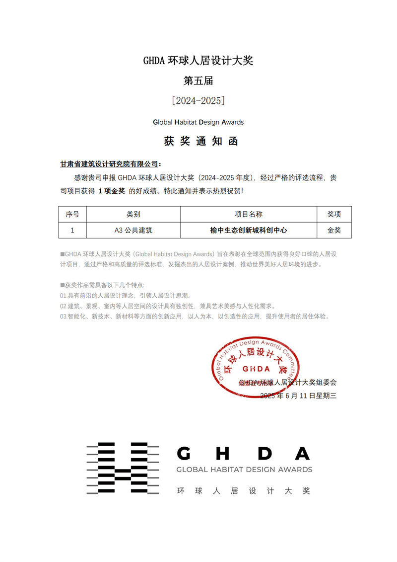 近日,備受矚目的第五屆GHDA環(huán)球人居設(shè)計大獎獲獎名單揭曉。甘肅工程咨詢集團旗下省建筑設(shè)計院精心打造的榆中生態(tài)創(chuàng)新城科創(chuàng)中心項目,繼榮獲美國綠色建筑委員會頒發(fā)的LEED V4 BD+C鉑金級預認證、中國綠色建筑三星級預評價兩項權(quán)威認證后,再度摘得公共建筑類金獎,彰顯出我省在人居設(shè)計領(lǐng)域的卓越實力。